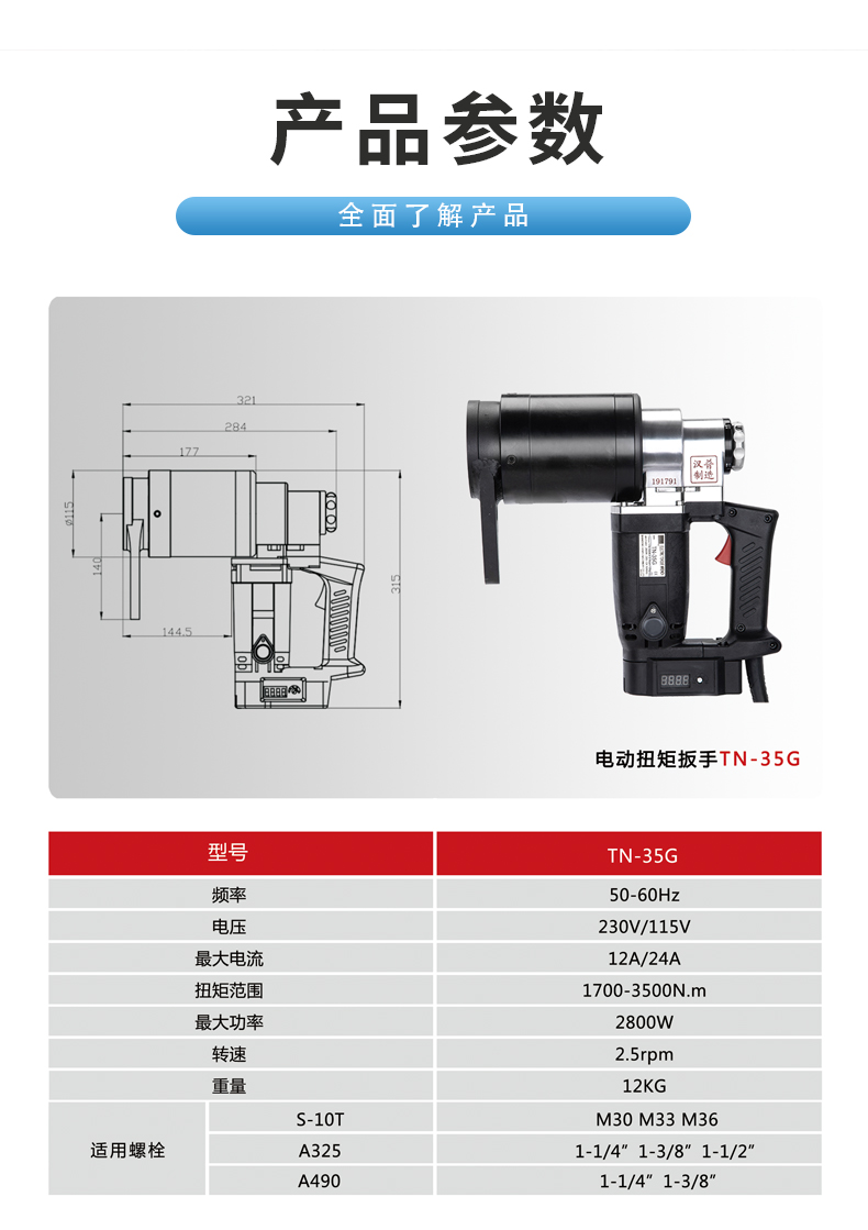 电动扳手哪个牌子扭力大 发表日期:2023-10-30 电动扳手是扳手的一种,电动扳手是以电源或电池为动力的扳手,是一种拧紧螺栓的工具,目前市面上电动扭矩扳手品牌众多,如何选择一把性价比高的电动扳手呢?下面给您推荐一个具有市场很高声誉的品牌——汉普电动扭矩扳手。电动扭矩扳手TN-35G汉普电动扭矩扳手主要云用来紧固大六角高强螺栓,其工作时需要提前设定好扭矩值,当扳手达到设定好的扭矩值时,扳手自动停止。 汉普电动扭矩扳手推荐理由:1、采用大功率电机,动力强劲2、带有数显控制器,扭矩控制精度高,重复精度达±3%3、采用加大通风孔设计,散热快4、采用汉普一体式高强度反力臂,坚固耐用公司介绍:山东汉普机械工业有限公司,是集研发、生产、销售于一体的电动工具厂家,主营产品:电动扭剪扳手、电动扭矩扳手、便携式螺栓扭矩检测仪、轴力扭矩仪、轴力计等,经过二十多年的创新与发展,公司现拥有62亩工业园区及3万平米生产研发车间,引进了大量瑞士、德国、日本制造的加工设备,成为国内规模较大的电动扳手生产基地。山东汉普欢迎您的咨询,咨询电话:18653495537,微信同号!