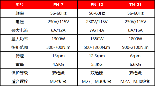 PN-7是初紧型电动扭矩扳手,适用于高强螺栓M24的初紧。扭矩范围是300-700N.m,重量为4.5KG,转速为15rpm。