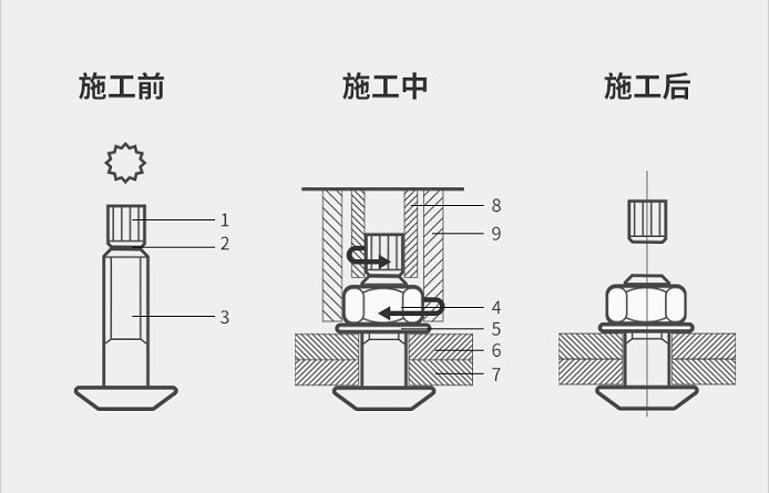 扭剪型螺栓使用扭剪型扳手施工,其根部使用正反方向扭杆直接通过“梅花头”夹紧螺杆本身,故施拧时不会发生同转现象,其产品的设计思路是:利用螺杆大道预拉力值时,材料所能承受对应的剪力,来设计削弱梅花头根部截面,达到剪断的目的。