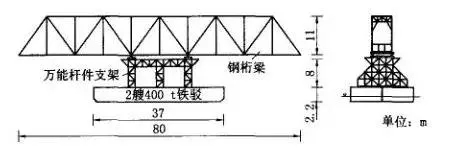 图13?某80m简支钢桁梁采用浮运法架设示意图