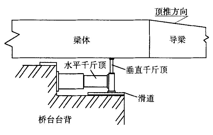 顶推法施工原理是沿桥纵向在台后设置拼装场,拼装完成钢梁后,通过水平千斤顶(见图6)施力,借助滑道、滑块(见图7),将钢梁向前顶推,就位后落梁,更换正式支座。