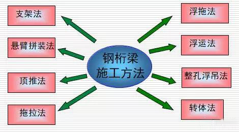 钢桁梁可以依据实际地形地貌采取多种方法架设,施工方法灵活多样,钢桁梁常用的施工方法有支架法、悬臂拼装法、顶推法、拖拉法、浮拖法、浮运法、整孔吊装法、转体法等(详见图1)。