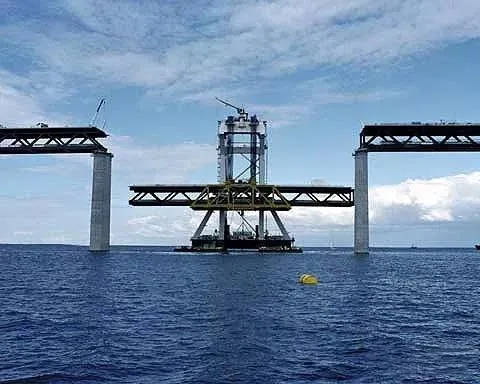 图14?丹麦厄勒海峡大桥140m钢桁梁采用整孔浮吊法施工架设