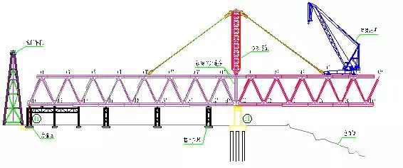 如图3为京沪高铁济南黄河特大桥采用悬臂法施工。当悬臂很大时可以辅以吊索塔架进行钢桁梁悬臂拼装施工,如图4和图5分别显示了长寿长江大桥196m钢桁梁、上海金山铁路支线112m钢桁梁采用设吊索塔架的悬臂拼装法施工。