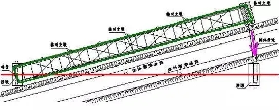 钢梁小角度跨越既有公路或铁路时,可先顺既有道路方向架设若干个临时支墩,并在这些临时支墩上完成钢桁梁的拼装,然后在梁端临时支墩与铁路对面的桥墩之间搭设滑道,滑道上铺设四氟滑板减小摩阻力,固定的钢梁一端设置转盘,最后使用外加拉力拖拉使钢梁通过滑道逐步转体至设计位置。上海金山铁路支线96m钢桁梁、集包铁路古城湾特大桥132m钢桁梁均采用转体法施工,见图16-18。