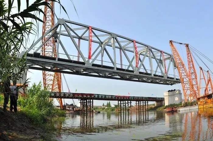 图15?海洋铁路岔洋河特大桥64m钢桁梁采用整孔浮吊法施工架设