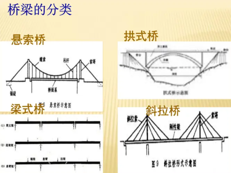 中囯的桥种类:外观来分,可分为梁桥、拱桥、斜拉桥、悬索桥、高架桥、组合体系桥;而按用途来分,又可分为铁路桥、公路桥、管道桥、多用桥(立交桥属于公路桥)。