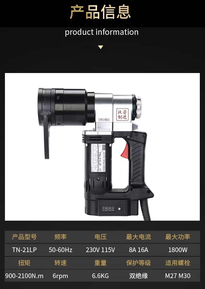 汉普电动力矩扳手种类多样,型号齐全,涵盖了扭矩值从100-10000N.m,可紧固的大六角高强螺栓从M12-M56,无论是在产品性能还是操作使用都是一款好用的电动力矩扳手。