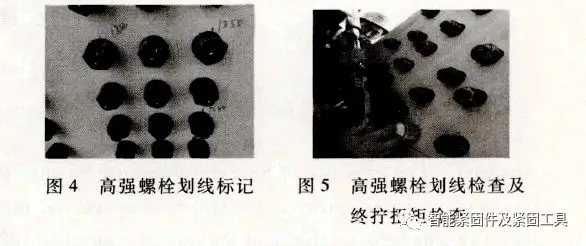 桥梁钢结构高强螺栓施拧过程控制 发表日期:2024-09-05 桥梁钢结构高强螺栓施拧采用电动扳手,对于电动扳手无法施拧的螺栓采用扭力扳手施拧,电动扳手和扭力扳手每班使用前必须经检测合格后方可使用,每班使用后要再次进行扳手标定。1 构件检查 钢结构杆件出厂前需要经过驻场监造、驻场监理和第三方检测单位分别检查合格,试拼装合格,每个螺栓孔通孔合格,摩擦面合格后方可装船运至桥梁现场,进行吊装架设,保证钢梁架设质量。2 初拧 如沪通长江大桥钢梁架设采用支架拼装和悬臂拼装2种方式。采用支架拼装时冲钉和高强螺栓数量不得小于孔眼总数的1/3,其中冲钉占2/3;悬臂拼装时冲钉用量按受力计算,并不得少于孔眼总数的l/2,其余孔眼布置高强螺栓,冲钉和高强螺栓应均匀安装。 初拧从节点中刚度大的部分向不受约束的边缘进行,对大节点则应从连接板中心呈螺旋状向四周逐个施拧。初拧扭矩取终拧扭矩值的50% ,初拧结束后对每个螺栓用敲击法进行检查,用白色油漆做好初拧标记线[6] 。3 终拧 初拧结束经监理检查同意后,逐个终拧螺栓至终拧值,终拧扭矩值按下式计算。T =K ·P ·d (1)式中:为终拧扭矩值,N-m;K为高强螺栓连接副扭矩系数工地复验数据平均值;P 为高强螺栓的施工预拉力,kN,P,=1.05×设计预拉力P;d为高强螺栓公称直径,mm。高强螺栓拉力值见表4。 温度和湿度对扭矩系数和高强螺栓施拧质量影响很大,雨天、大雾天气和夏季烈日下不得进行高强螺栓施拧。雨天过后,摩擦面和螺栓孔干燥后方可进行高强螺栓施拧[7] 。5 高强螺栓终拧检查 高强螺栓终拧扭矩检查应在终拧4 h后,24 h以内进行。高强螺栓在终拧结束后,对已施拧的高强螺栓用检查扳手,采用“松扣、回扣法”全部进行检查。查看初拧后白色油漆标记线转动情况,判断是否存在漏拧、跟转现象。漏拧用检查扳手补拧到位;若发现垫片、螺栓上白线发生转动,应成套更换。终拧完成自检合格后,用红色油漆做好标记线,然后报监理检查;监理检查合格后,用黄色油漆做好标记,见图4和图5。做好检查记录,并及时涂填缝腻子防止雨水进入,并尽快涂装。 检查扭矩Tch 的计算公式 为Tch= K·P·d (2)扭矩在0.9T ~1.05T 范围内为合格。施工单位自检全部检查,监理单位每个栓群或节点板见证检查10% ,抽查见证中的1% ,经过自检和监理单位检查,高强螺栓施拧全部合格(见表5)。 文章来源于:智能紧固件及紧固工具,如侵权请联系删除。
