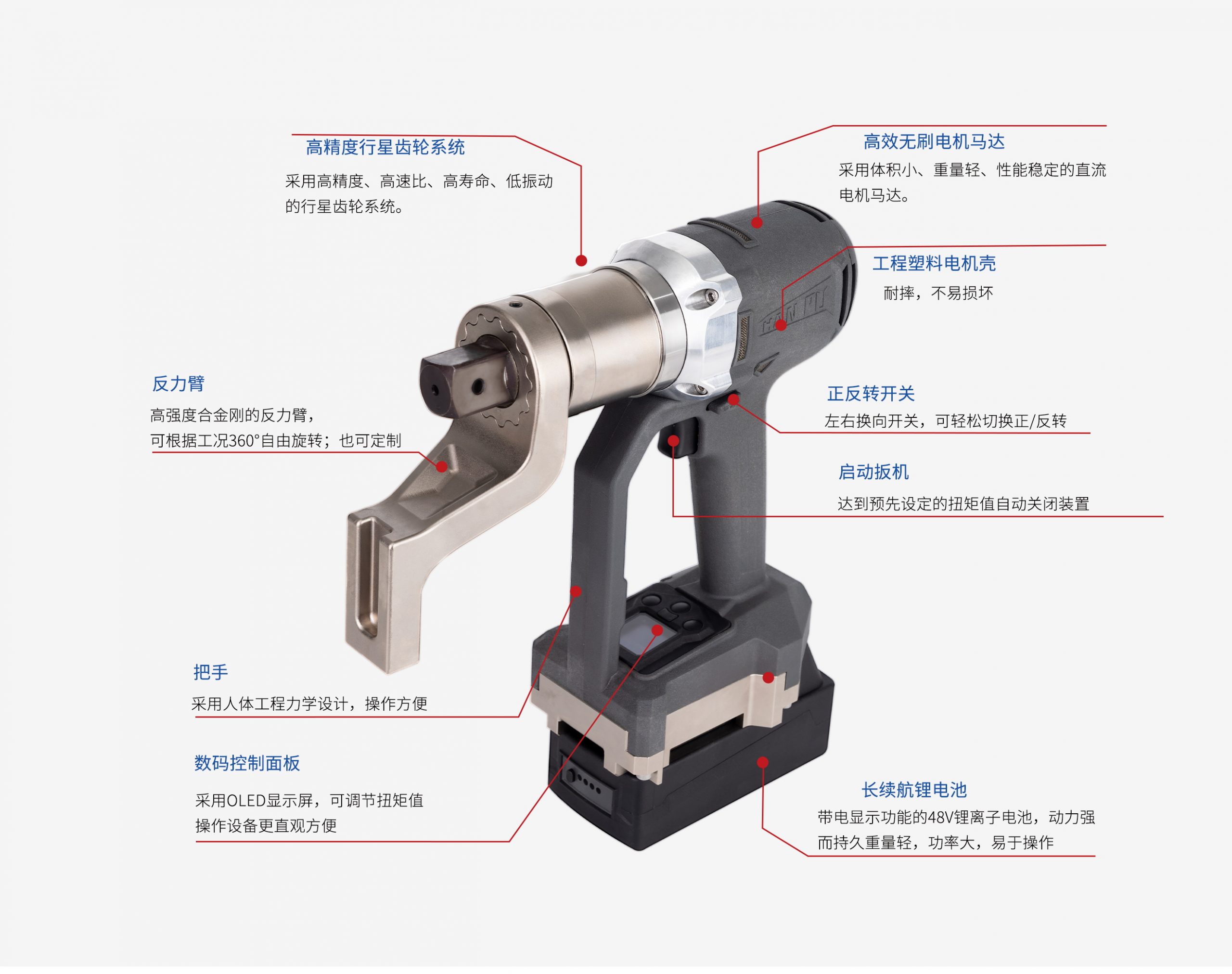 机器达到扭矩后自动停止转动,带有正反两个档位,不但可以紧螺丝也可以卸螺丝,工作时,机器不带有冲击,需要反力臂提供发作用力,扳手输出部为标准四方头,可配套各种通用套筒或接头。