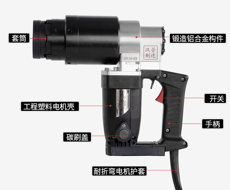 该产品专门用于紧固高强度扭剪螺栓,并且在紧固完成后将剪断的梅花头保留在套筒内部不掉落,随后扣动扳机将梅花头弹出,动力为220V或110V交流电源,相比较与传统六角螺栓,扭剪螺栓配合电动扭剪扳手,施工方便快捷,扭矩控制准确并且方便检查。