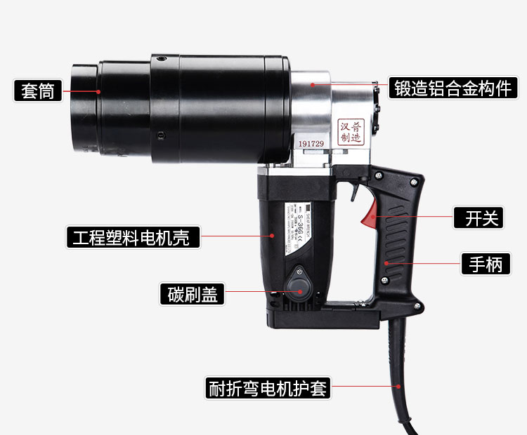 该产品专门用于紧固高强度扭剪螺栓,并且在紧固完成后将剪断的梅花头保留在套筒内部不掉落,随后扣动扳机将梅花头弹出,动力为220V或110V交流电源,相比较与传统六角螺栓,扭剪螺栓配合电动扭剪扳手,施工方便快捷,扭矩控制准确并且方便检查。