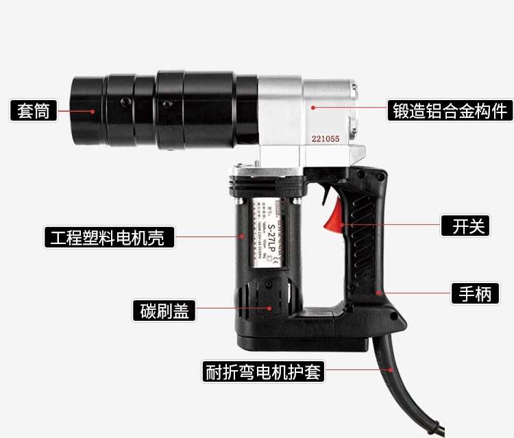 该产品专门用于紧固高强度扭剪螺栓,并且在紧固完成后将剪断的梅花头保留在套筒内部不掉落,随后扣动扳机将梅花头弹出,动力为220V或110V交流电源,相比较与传统六角螺栓,扭剪螺栓配合电动扭剪扳手,施工方便快捷,扭矩控制准确并且方便检查。
