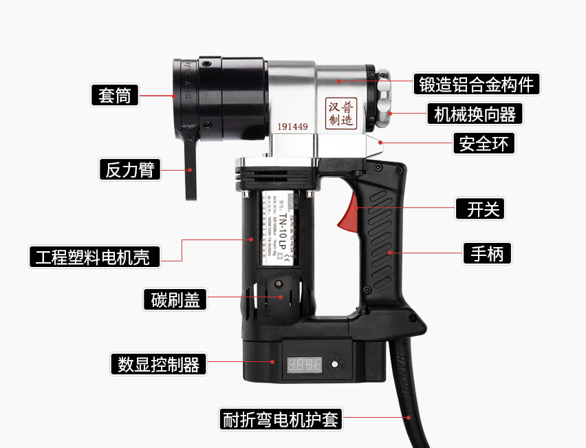 Y系列电动扭矩扳手工作时提前设定好要求的扭矩,机器达到扭矩后自动停止转动,带有正反两个档位,不但可以紧螺丝也可以卸螺丝,工作时,机器不带有冲击,需要反力臂提供发作用力,Y系列电动扭矩扳手配有专用的反力臂套筒。