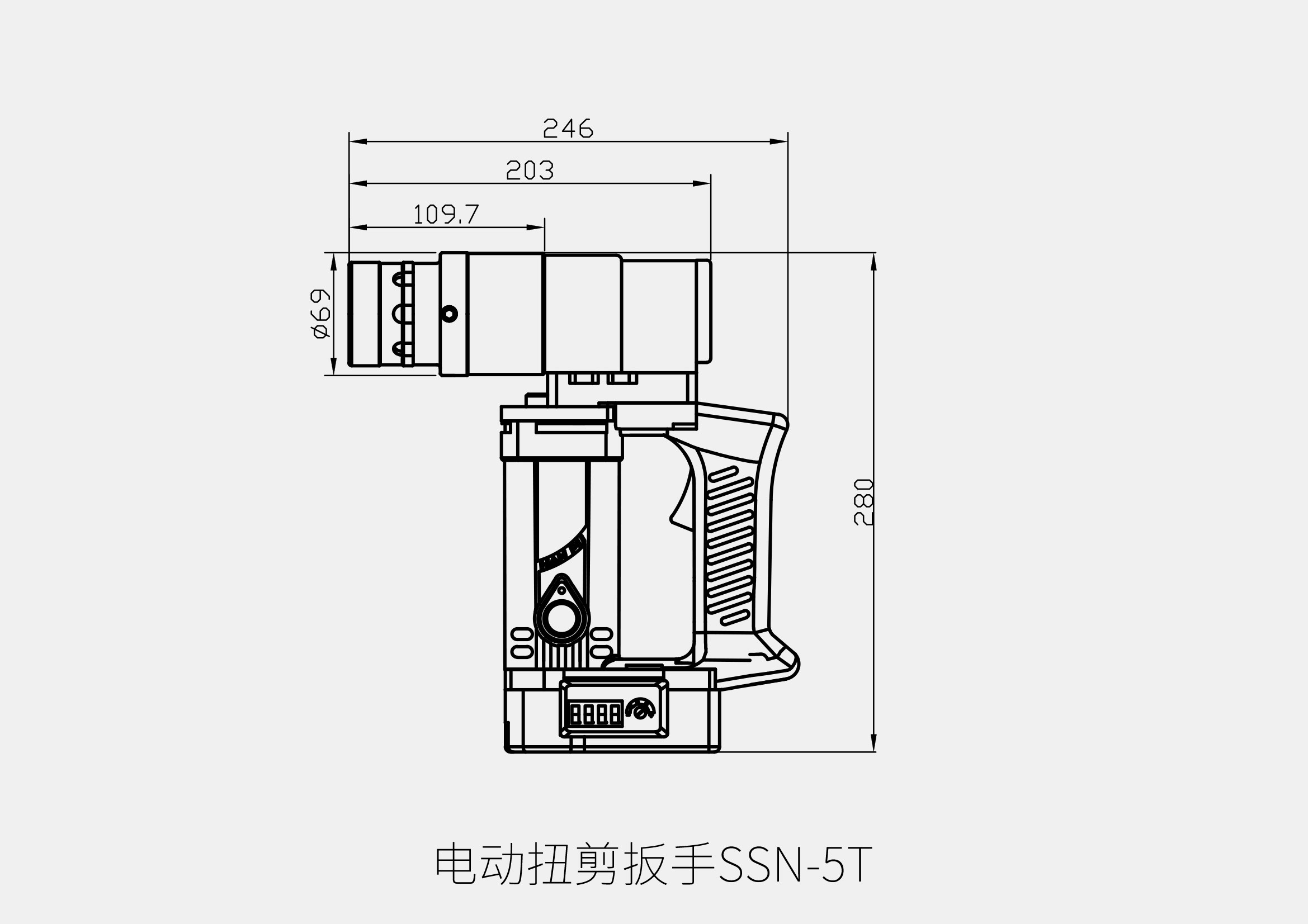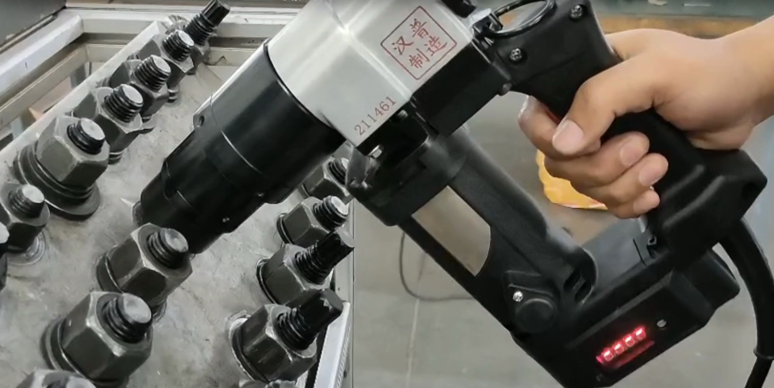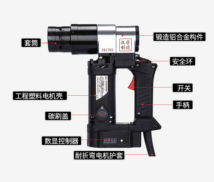 该产品专门用于初紧高强度扭剪螺栓,动力为220V或110V交流电源,相比较与传统六角螺栓,扭剪螺栓配合电动扭剪扳手,施工方便快捷,扭矩控制准确并且方便检查。