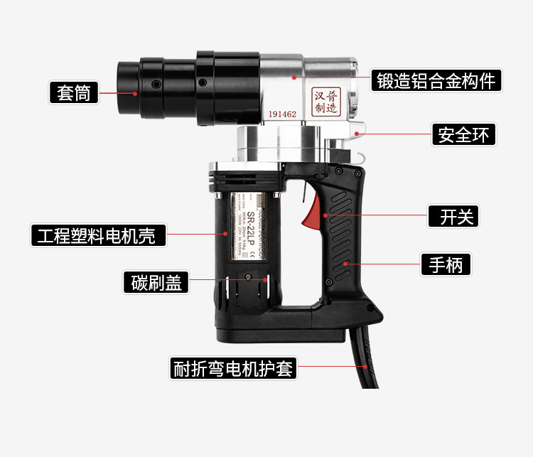 该产品专门用紧固高强度扭剪螺栓,动力为220V或110V交流电源,相比较与传统六角螺栓,扭剪螺栓配合电动扭剪扳手,施工方便快捷。