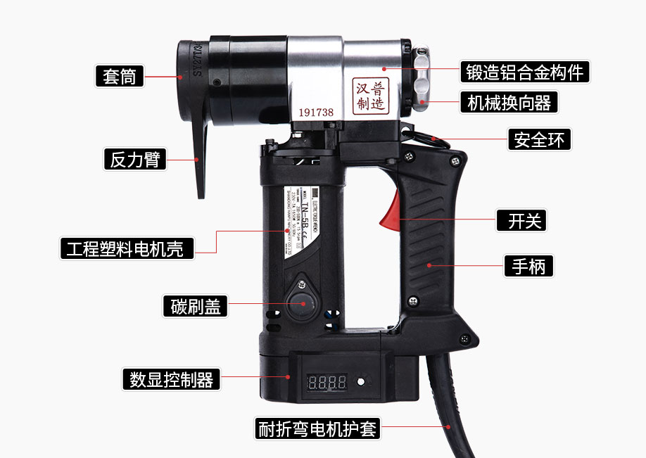 Y系列电动扭矩扳手工作时提前设定好要求的扭矩,机器达到扭矩后自动停止转动,带有正反两个档位,不但可以紧螺丝也可以卸螺丝,工作时,机器不带有冲击,需要反力臂提供发作用力,Y系列电动扭矩扳手配有专用的反力臂套筒。