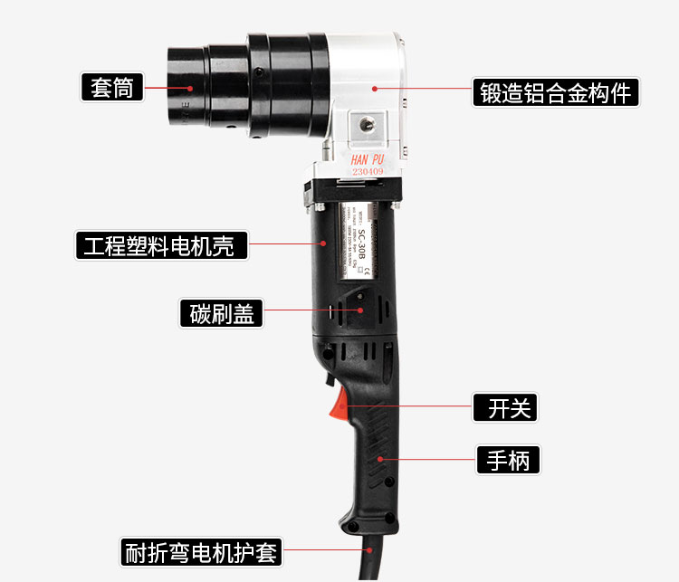 该产品专门用紧固高强度扭剪螺栓,动力为220V或110V交流电源,相比较与传统六角螺栓,扭剪螺栓配合电动扭剪扳手,施工方便快捷。